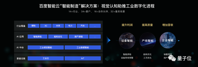 智能制造充分利用了百 度AI的视觉认知能力,打通数据获取和理解。帮助工业制造企业解决数字化升级的过程中,大量数据无法处理的情况,提升生产、物流、销售效率。