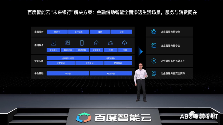 未来银行是依托知识中台,将门类繁多的零售金融产品构建出一套完善的知识体系,实现每一台手机、屏幕、ATM都能够成为业务办理和成交的终端,相当于为每一位用户在不同场景中配置一位AI经理。