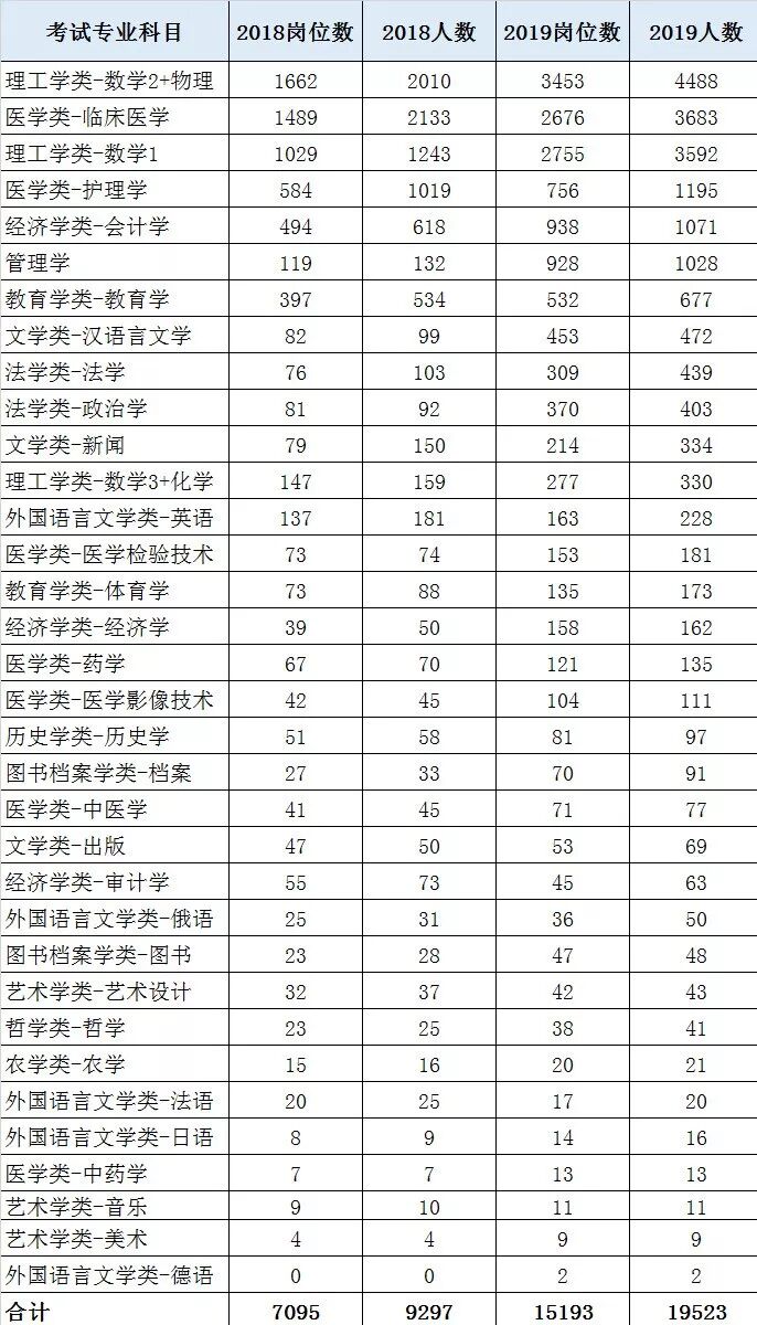 不难看出,在文职所有专业科目中,理工学类-数学2+物理、医学类-临床医学、理工学类-数学1等科目开放岗位占到了极大的比例,小语种、艺术学类专业则开放岗位较少。