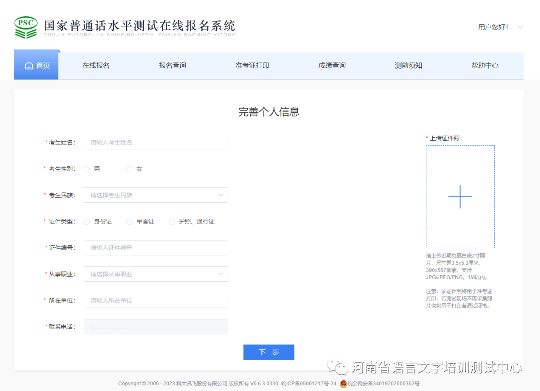 填写报名信息时需核对报名信息,确认无误后点击下一步。报名成功后报名信息将被锁定,错误信息无法更改,报到时如核对出信息不一致,将取消本次测试资格。