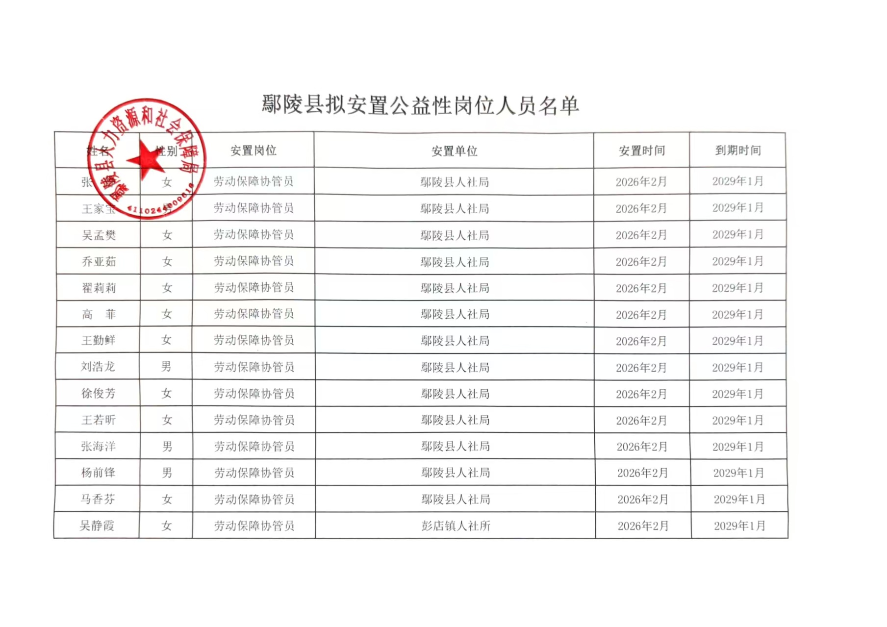 鄢陵县就业困难人员拟安置公益性岗位公示