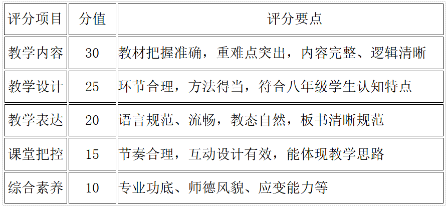 3.试讲环节(9:00开始)按序号依次进入考场,进行15分钟微型课试讲(八年级上册任选一课,无生授课),评委现场打分。